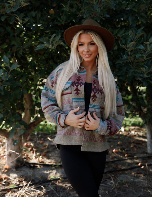 Be all about you in our perfect aztec Shacket! Not familiar with Shacket? It's a slightly oversized shirt-jacket hybrid that will be your must have for the fall and winter! This Shacket can be perfectly paired with a light weight top and our favorite SA Exclusive Leggings!