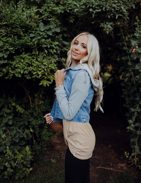 Check out this amazing jersey/denim Jacket. We are loving the classic look and it pairs well with any bottoms! The Hood is removable with buttons! How fun is that? Model is wearing a Small.